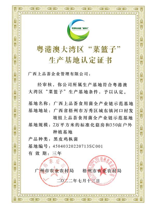 粵港澳區(qū)“菜籃子”生產(chǎn)基地認(rèn)定證書